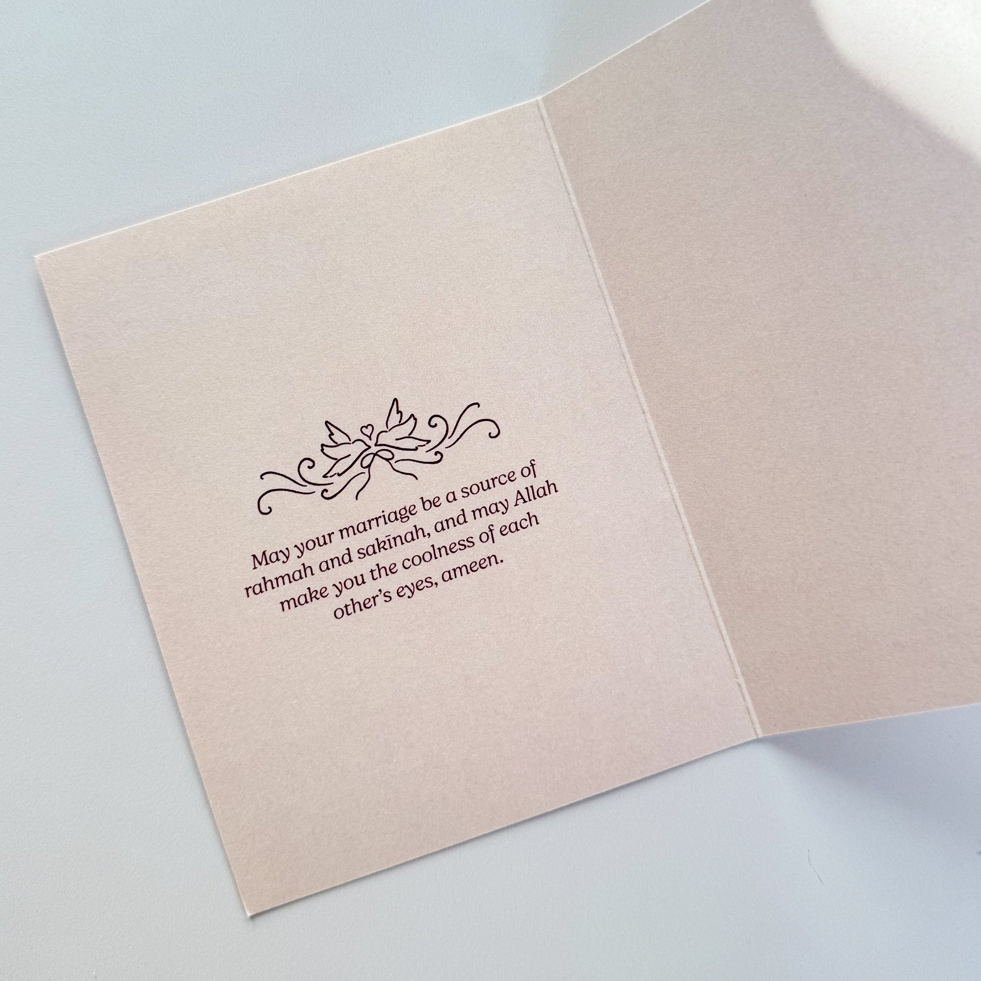 The inside of the card contains the message "May your marriage be a source of rahmah and sakinah, and may Allah make you the coolness of each other's eyes, ameen."