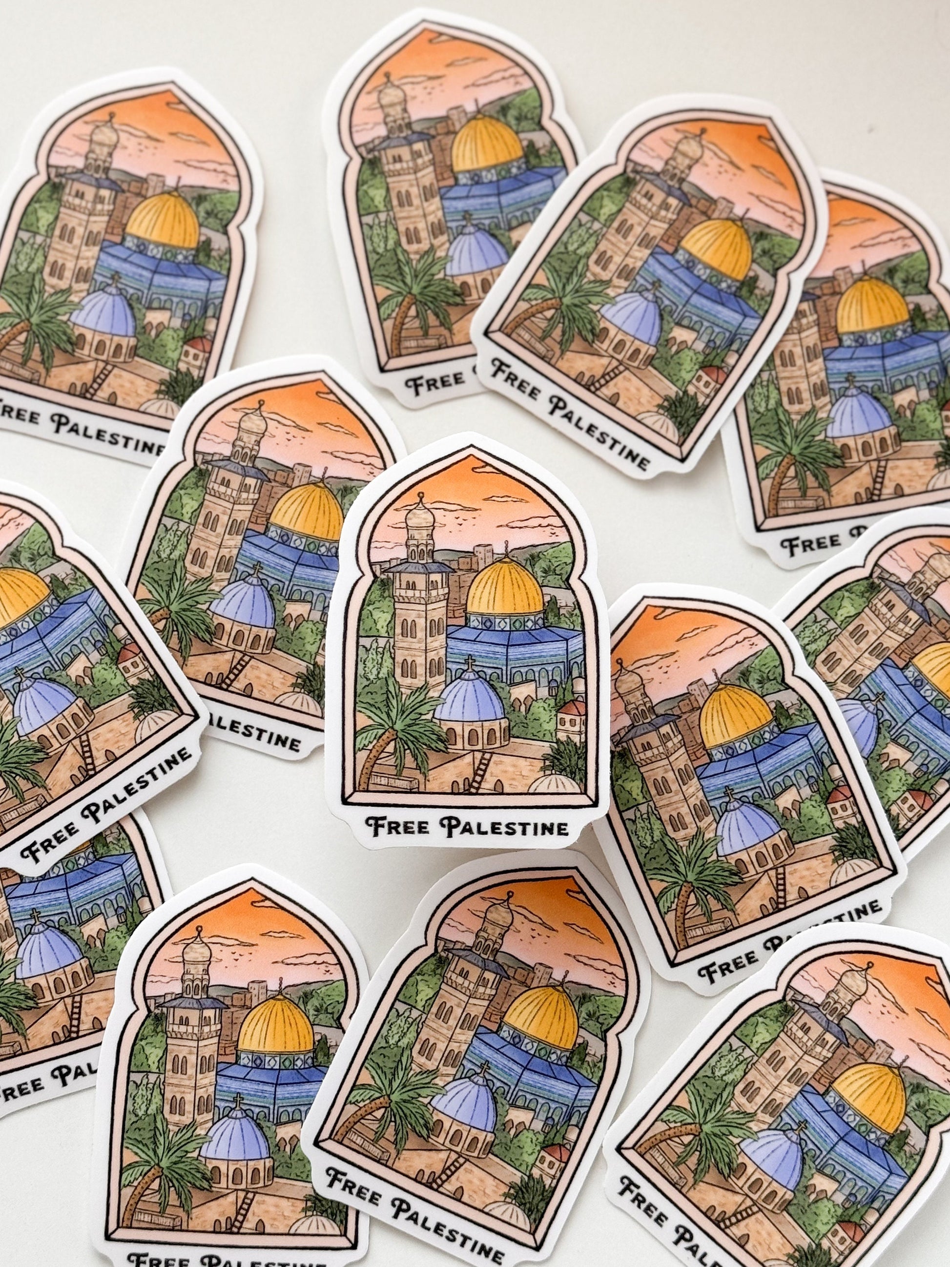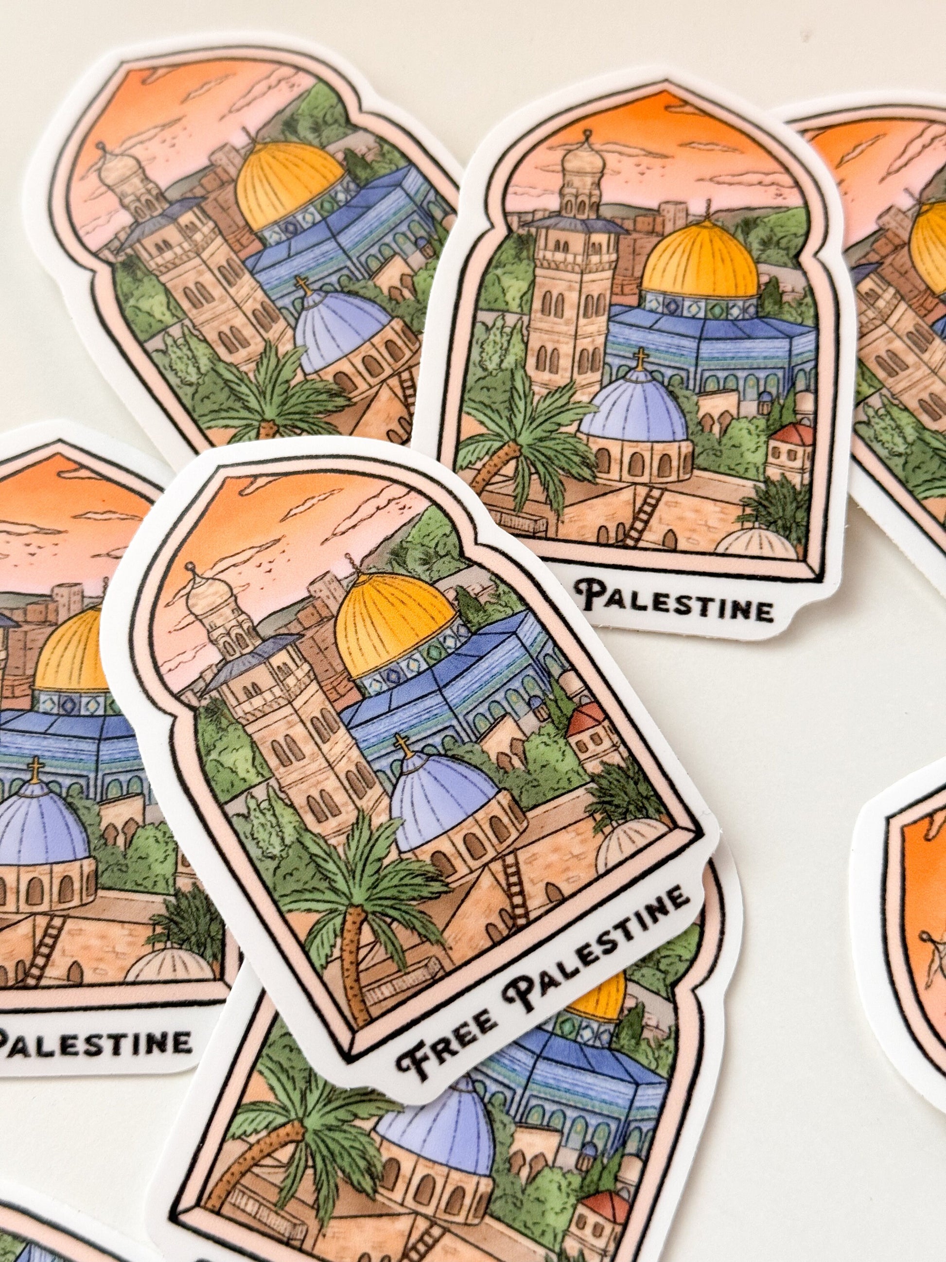 This is vibrant and detailed sticker of Jerusalem, featuring both the Church of the Holy Sepulchre and Masjid Al-Aqsa, nestled between lush greenery and palm trees. This sticker is perfect to add to your laptop, journal, and even water bottle to show your solidarity with Palestine.