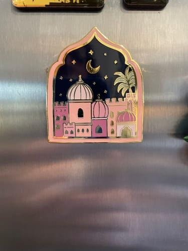 This is a stunning, high quality gold magnet of a series of purple and pink masajid and mediterranean styled villas set against a starry night sky.