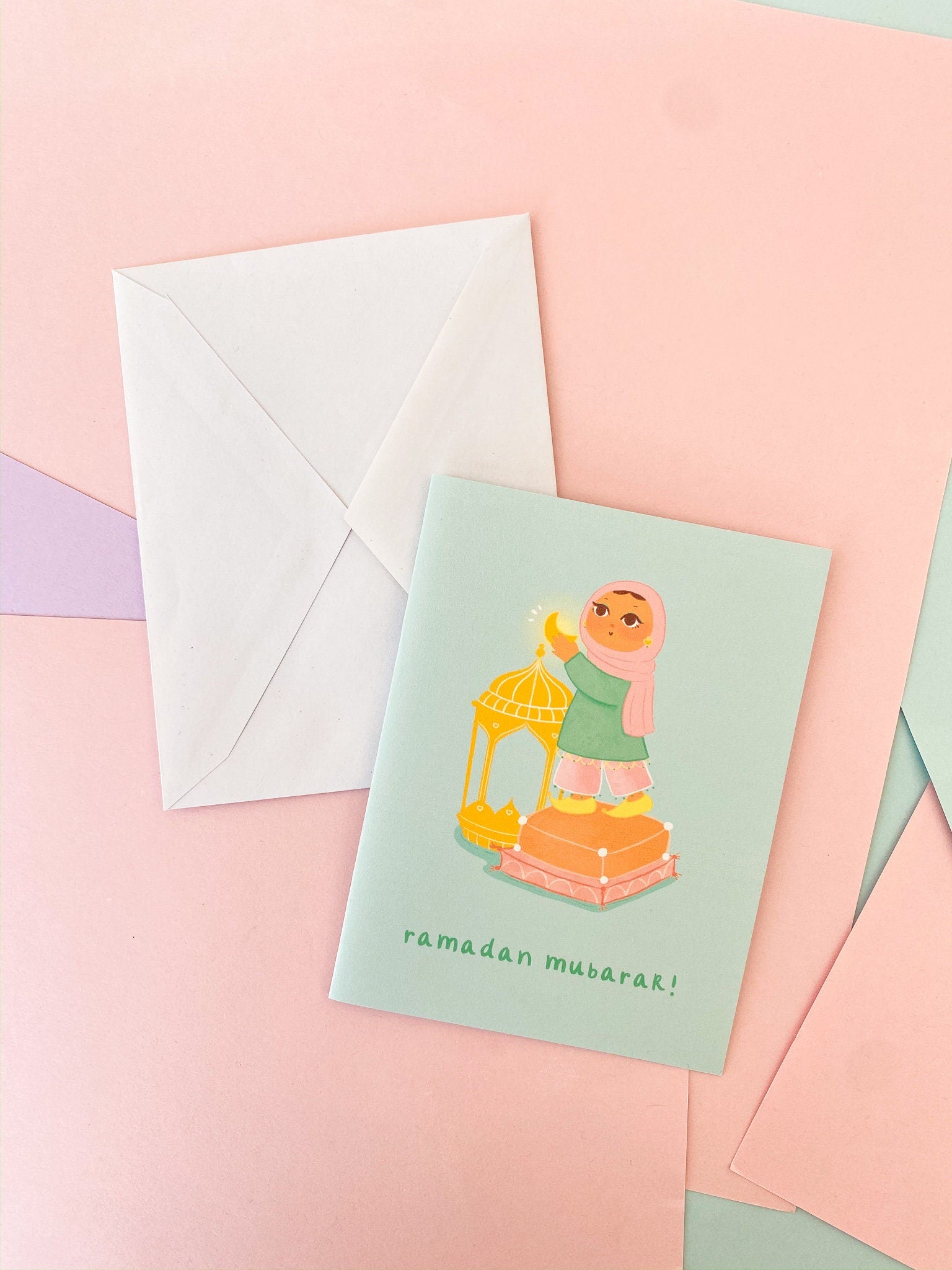 This is an adorable, pastel green Ramadan Mubarak greeting card featuring a little hijabi atop some brightly colored cushions leaning forward to set a glowing moon atop a lantern.