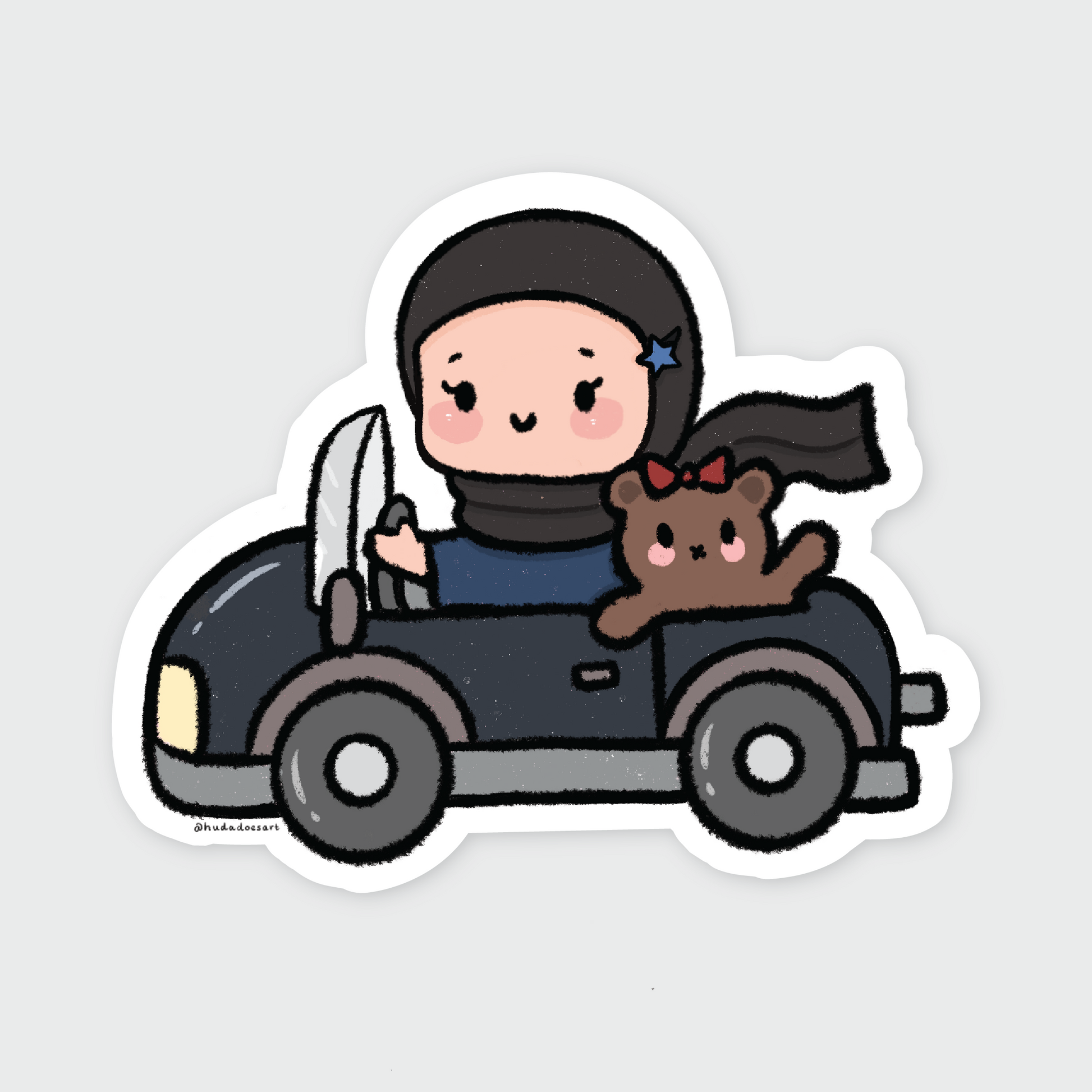 This is a cute sticker of an emo hijabi in a little black car with her cuddly bear friend.