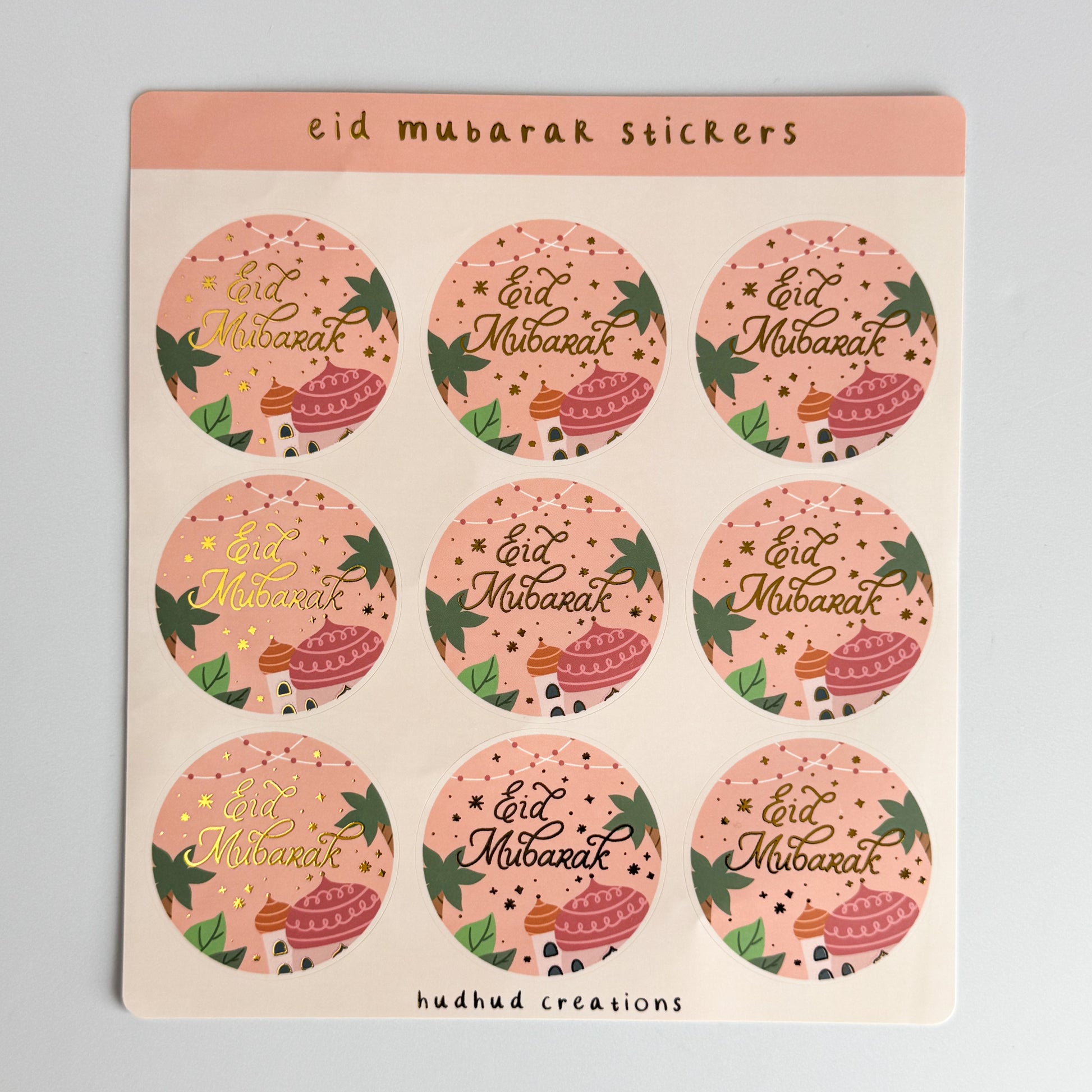 This is an Eid Mubarak sticker sheet filled with 9 beautifully illustrated, vibrant and gold-foiled 2" stickers. The pink sticker sheet features a decorated masjid and palm trees. The blue sticker sheet has little golden sparkles and decorative garlands, with a masjid in the center.
